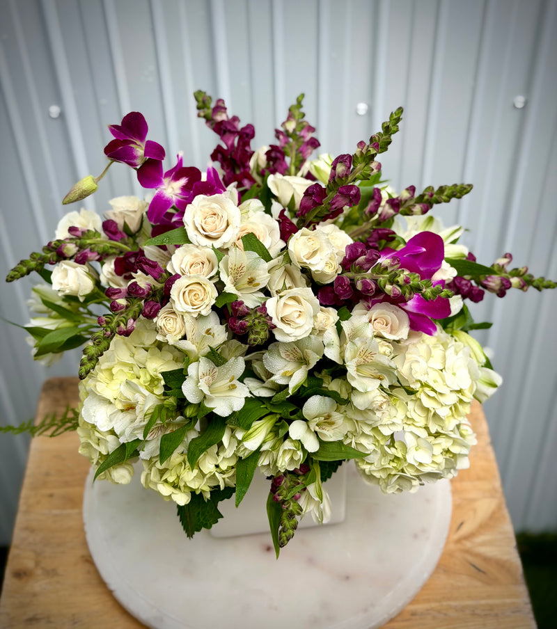 Let our expert designers create a stunning Florist’s Choice Arrangement just for you — beautifully arranged in an elegant white ceramic vase. Each piece is made with the freshest seasonal blooms, thoughtfully selected to match your preferred color palette and style. Whether you love soft pastels, vibrant brights, or classic neutrals, we’ll craft a one-of-a-kind floral design that delivers beauty and joy to any space.